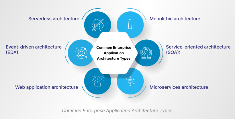بما أن إنشاء بنية تطبيقات مؤسسية مستقرة يساعد على التعامل مع التطبيقات المعقدة بسرعة، يُنصح بالبدء في ذلك في أقرب وقت ممكن. ومع ذلك، إليك أهم أنواع بنية تطبيقات المؤسسات التي تُساعد في تطوير البرمجيات، وإدارة التطبيقات، وما إلى ذلك. وتشمل هذه الأنواع ما يلي: