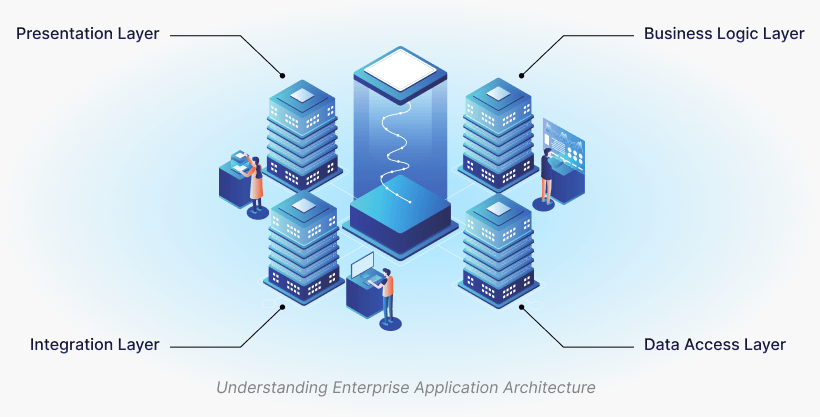 إن بناء منزل دون أي مخطط معماري سليم قد يؤدي إلى كارثة، وينطبق الأمر نفسه على تطبيقات برامج الشركات عند نشرها دون إعداد بنية تطبيقات مؤسسية مناسبة. تُعدّ بنية التطبيقات المؤسسية (EAA) مخططًا منظمًا وقابلًا للتطوير لكيفية تصميم التطبيقات داخل الشركة وبنائها وتطويرها ونشرها، بما يضمن التوافق مع رؤية العمل والامتثال للوائح. تشمل بنية التطبيقات المؤسسية البيانات والبرامج والأجهزة ومكونات الشبكة المتنوعة اللازمة لتشغيل الأعمال، وتتكون من أربع طبقات. هذه الطبقات هي: