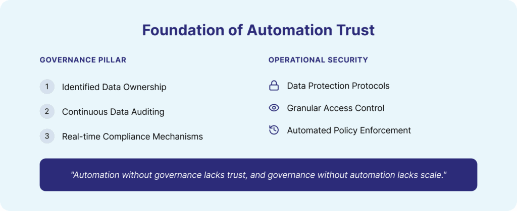 أصبحت الحوكمة ضرورة لا غنى عنها مع تطور أنظمة الأتمتة لتصبح أنظمة مستقلة. ينبغي أن تتم أتمتة العمليات الذكية مع تحديد واضح لملكية البيانات، ومراجعة البيانات، وآليات الامتثال. في غياب هذه الأسس، تزيد الأتمتة من المخاطر بدلاً من تقليلها.