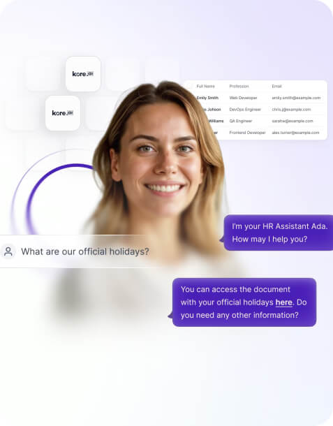 Kore.ai provides specialised generative AI-enabled assistants, such as HRAssist, RecruitAssist, and ITAssist, which are specially designed to optimise employee experiences. Leveraging these solutions allows you to automate workflows and provide effective support across HR, recruitment, and IT functions.