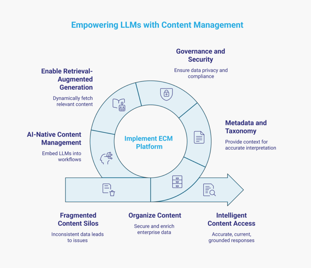 نحن الآن ندخل عصرًا تتقارب فيه إدارة المحتوى والذكاء الاصطناعي. أصبحت أنظمة إدارة المحتوى المؤسسي من الجيل التالي تعتمد على الذكاء الاصطناعي، حيث تُدمج برامج إدارة المحتوى (LLM) مباشرةً في سير عملها لتمكين: