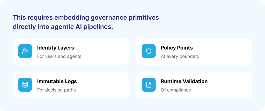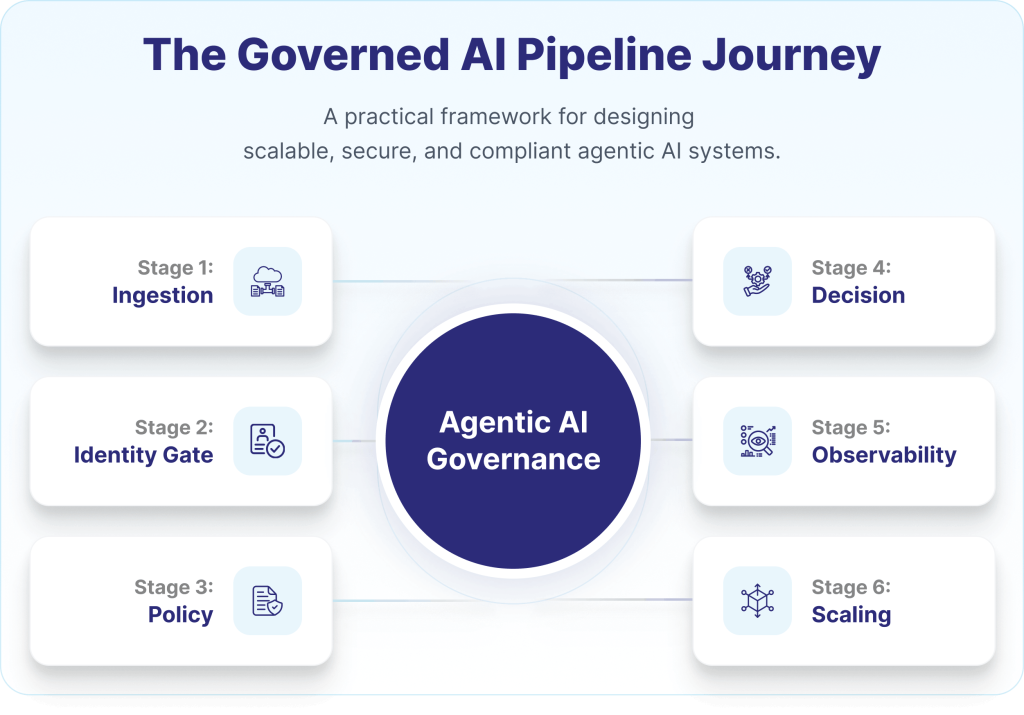 This is where agentic AI governance becomes essential. The pipeline must operate as a controlled environment in which every step from data ingestion to final action is continuously governed under clear AI compliance and governance controls.